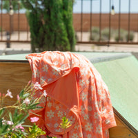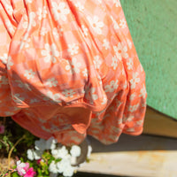 BRIGHT CORAL CHECKER + PINK DAISY FLORAL PRINT, WITH A BRIGHT CORAL SOLID REVERSE.