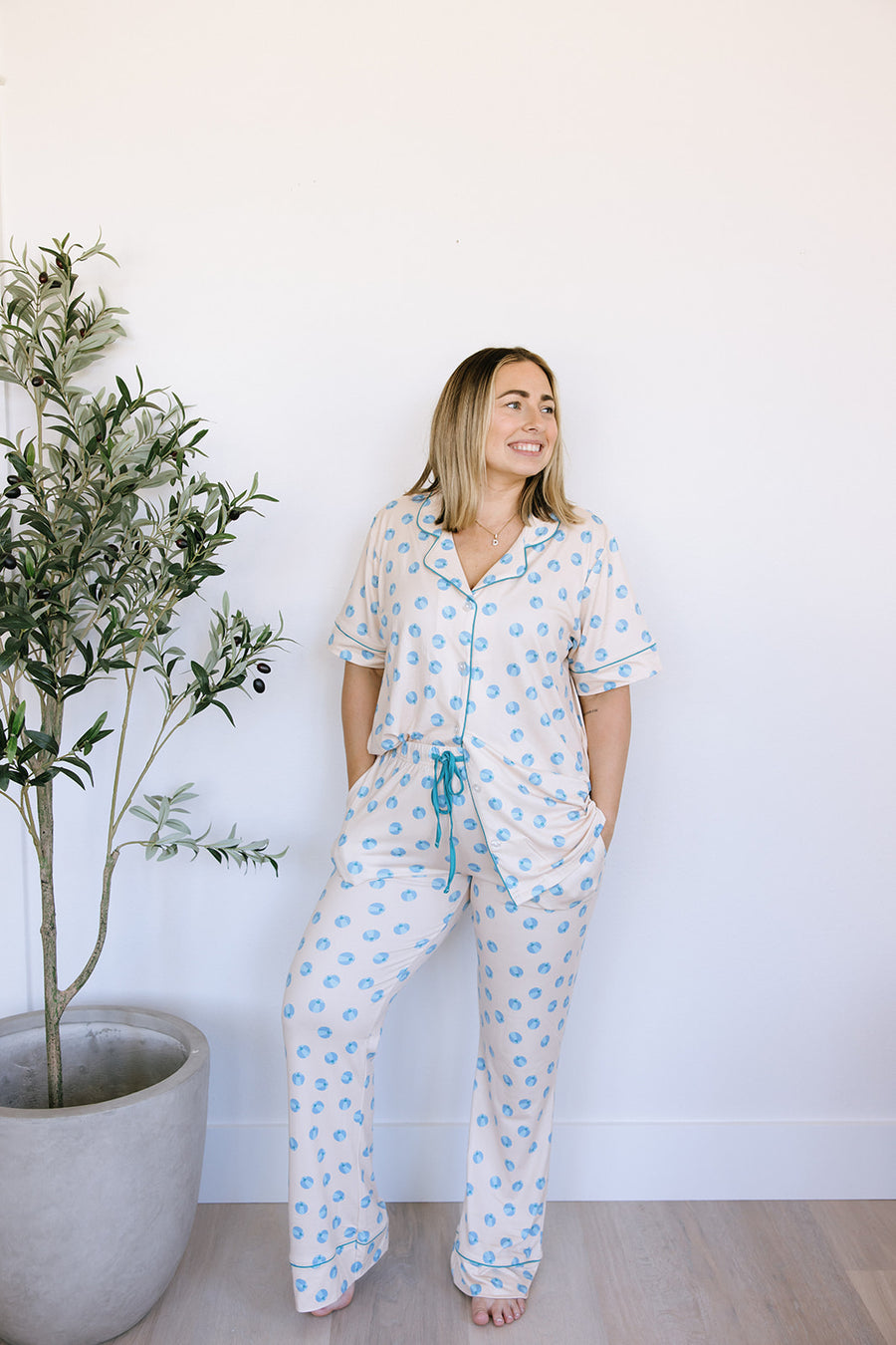 This short sleeve set is sure to be your new favorite. The top features a v-neck collar, a slightly oversized fit, straight hemline, premium buttons, and wrist cuffs.