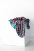 Teal smiley against a berry checker print paired with a teal solid reverse.