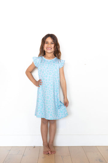 BLUE MINI HEARTS | RUFFLE SLEEVE DRESS