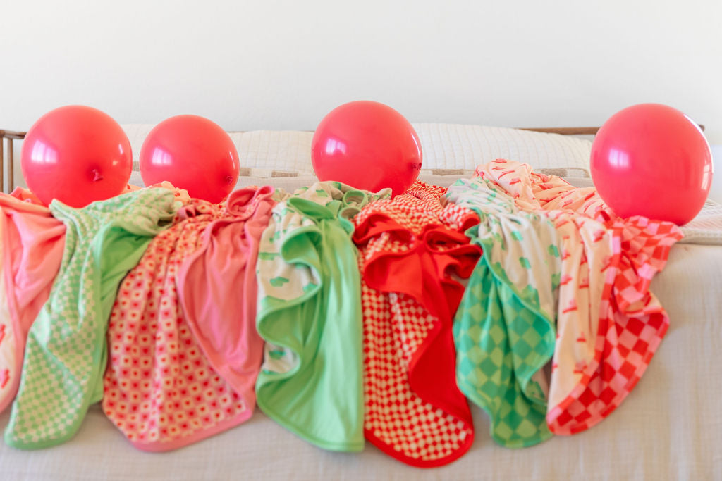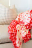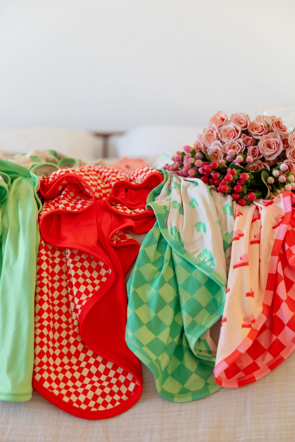 Coral pink, Red, and Bright Peach lightning bolt print with a Coral Pink + Bright Red checker reverse.