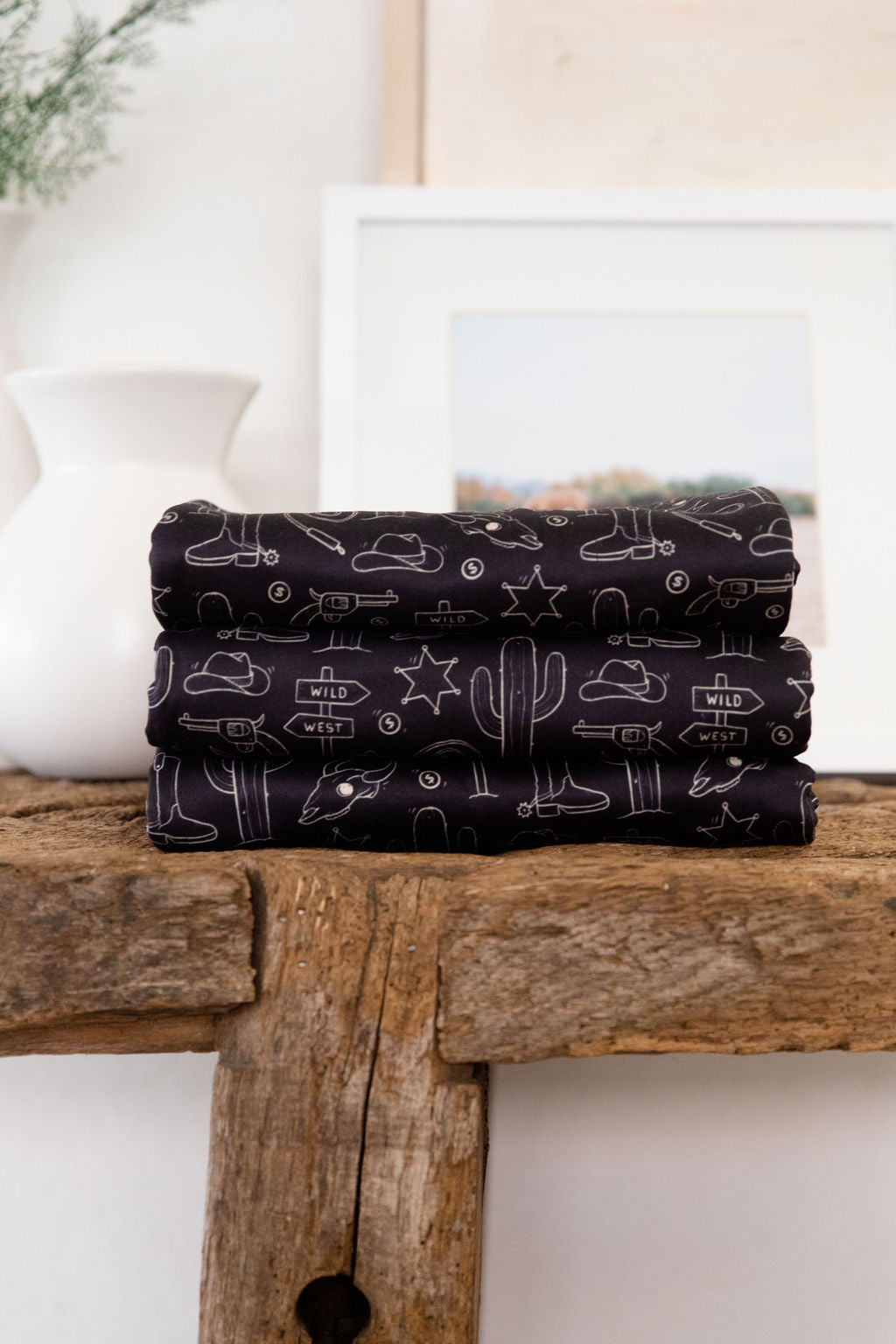 Sand + Dark Charcoal wild west print with a Sand solid reverse.