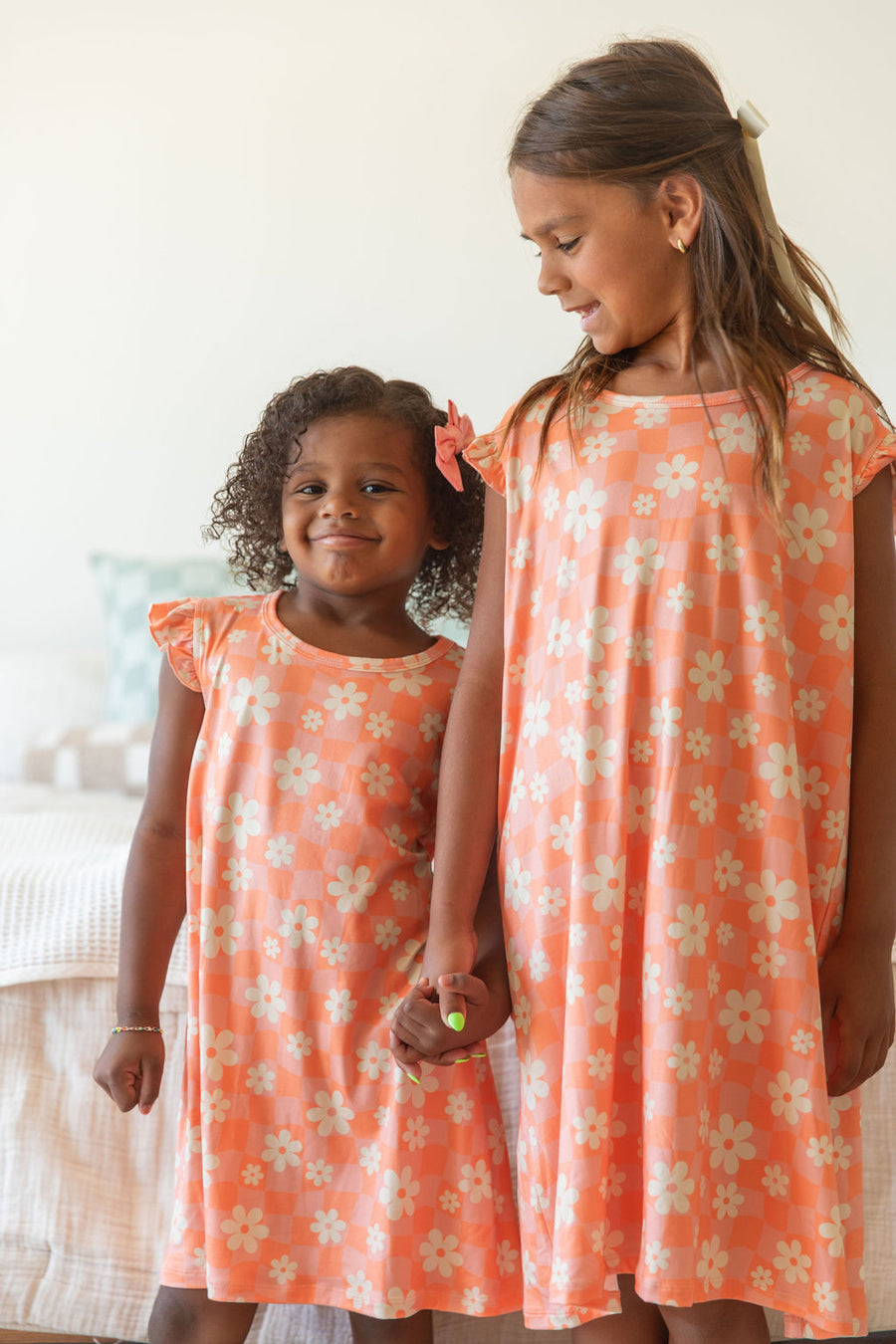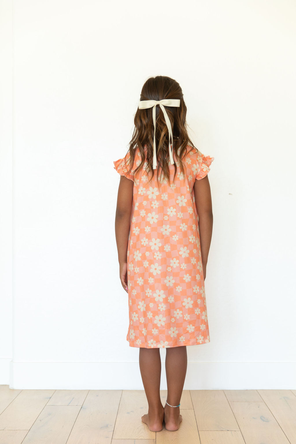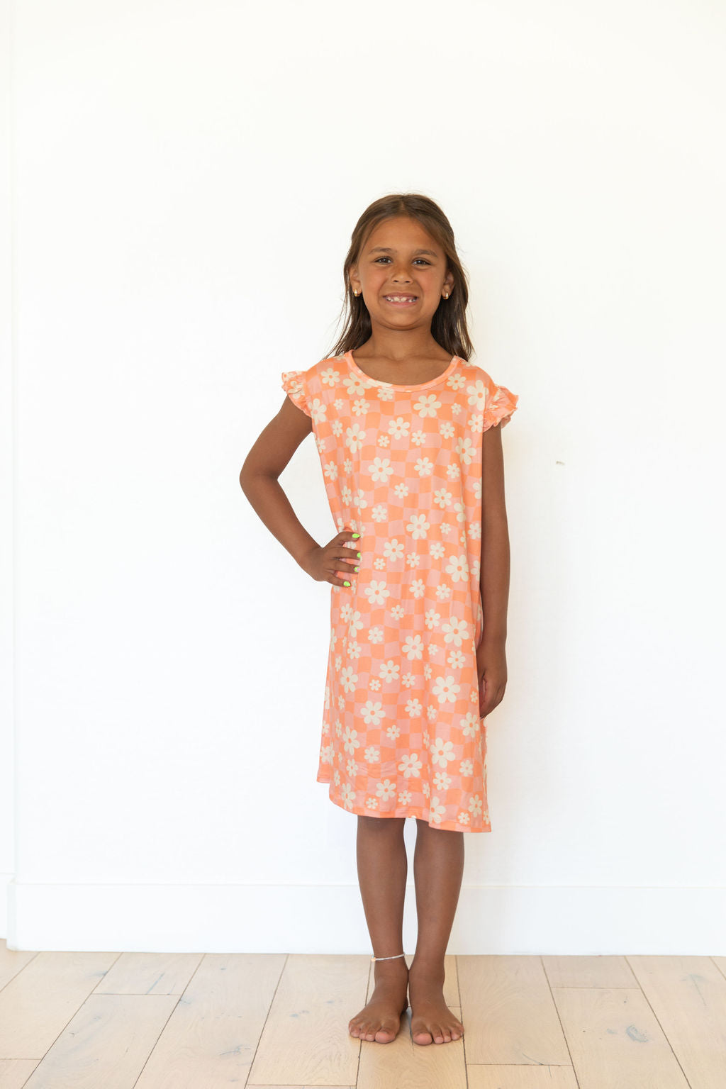 BRIGHT CORAL + PINK DAISY CHECKER | SLEEVE DRESS