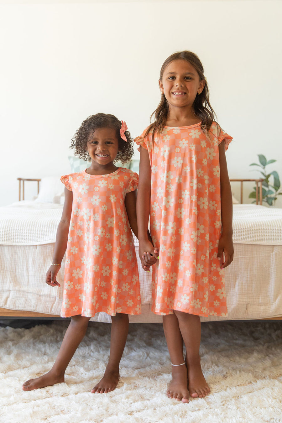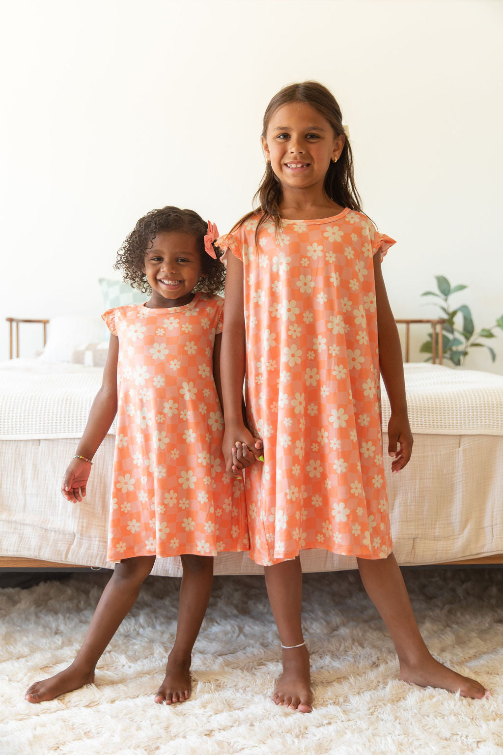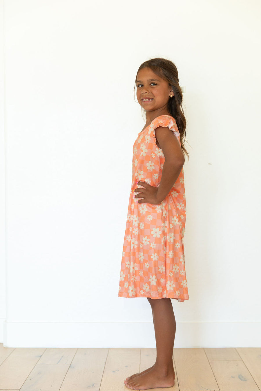BRIGHT CORAL + PINK DAISY CHECKER | SLEEVE DRESS