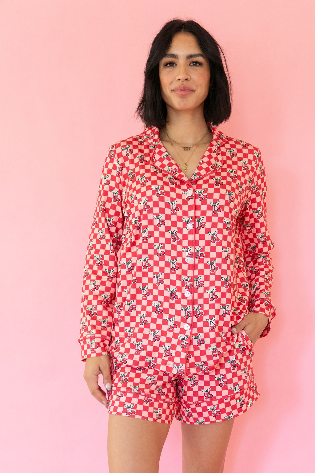 CHERRY CHECKER | WOMEN'S BUTTON UP LONG SLEEVE + SHORT SET