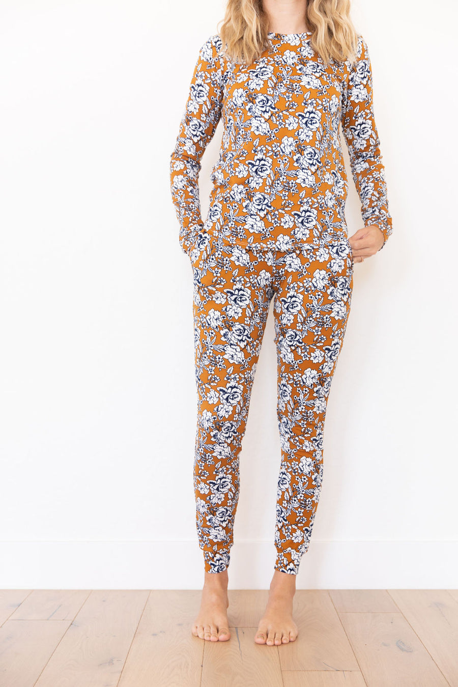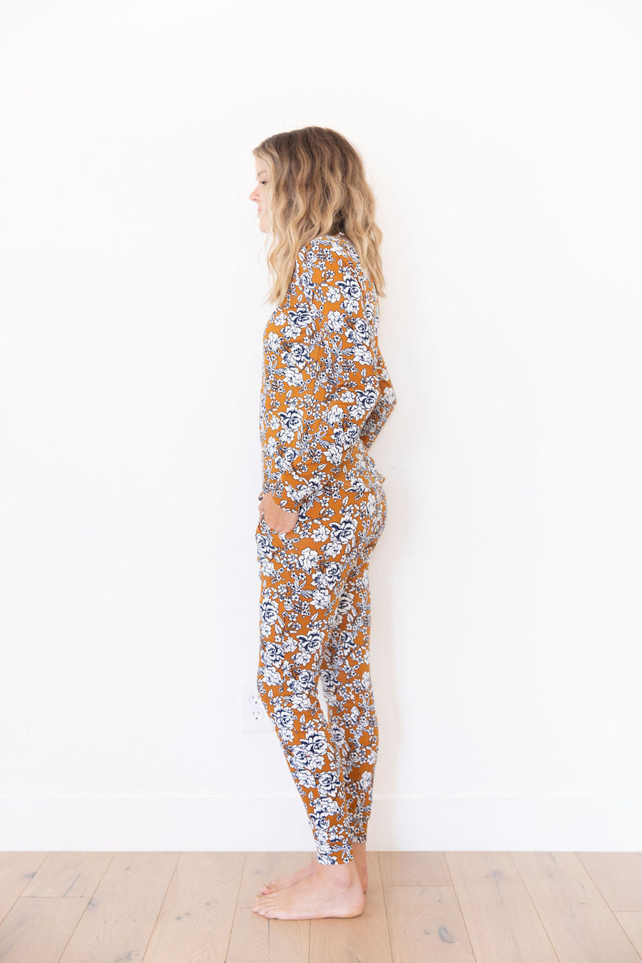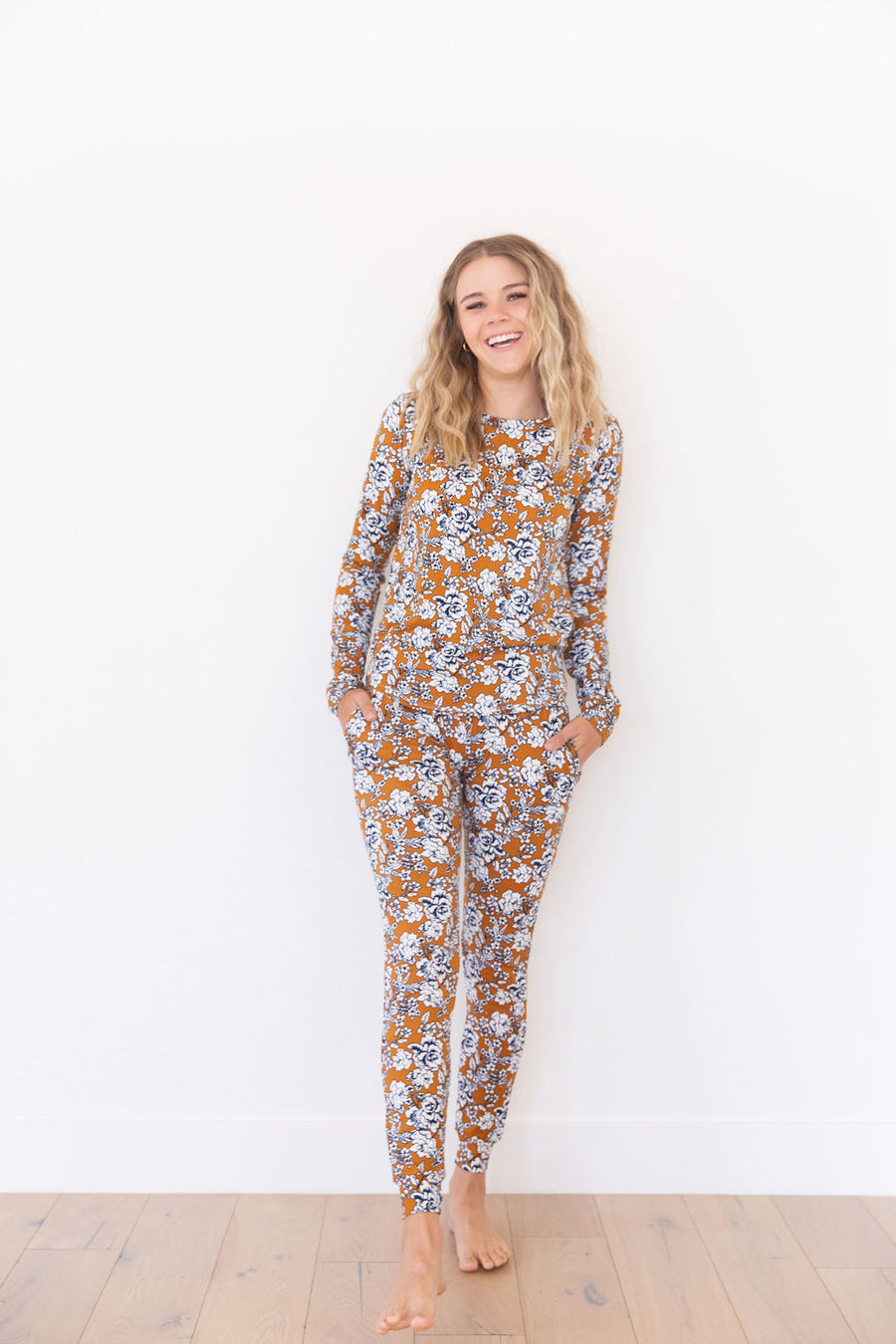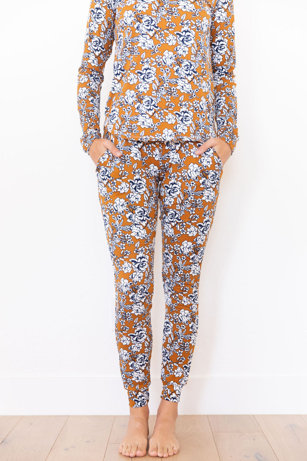 Dark Mustard + Navy Floral Women's Two Piece Set - Long Sleeve