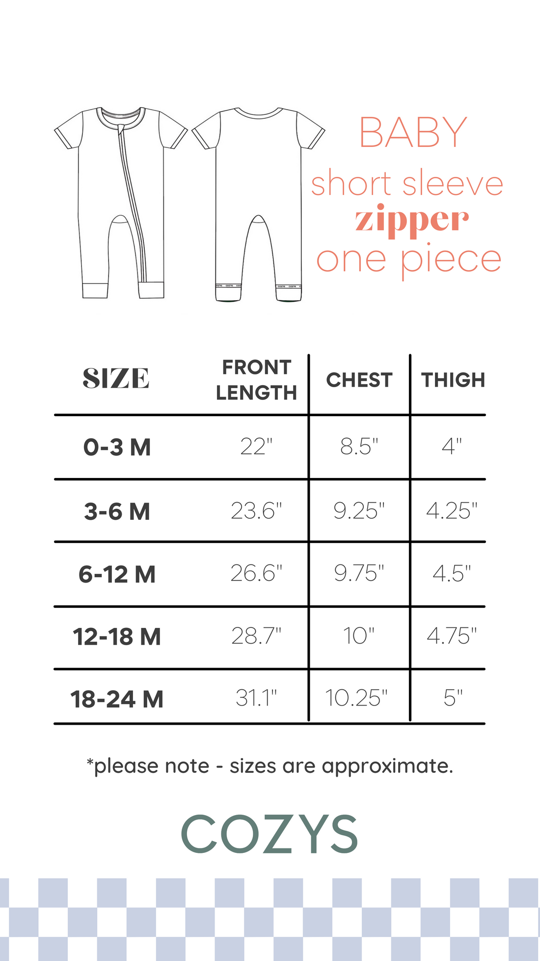 Our COZYS (brand new*) Short Sleeve Zipper One Pieces are made out of the same buttery soft fabric as our other products, and are tagless to eliminate irritation. The zipper makes it easy for those middle of the night diaper changes.