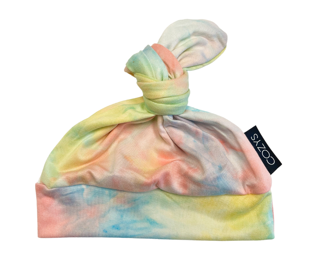 The Cozy top knot beanies are perfect for your new baby. They fit sizes 0-3 months and are made out of soft stretchable jersey knit fabric.