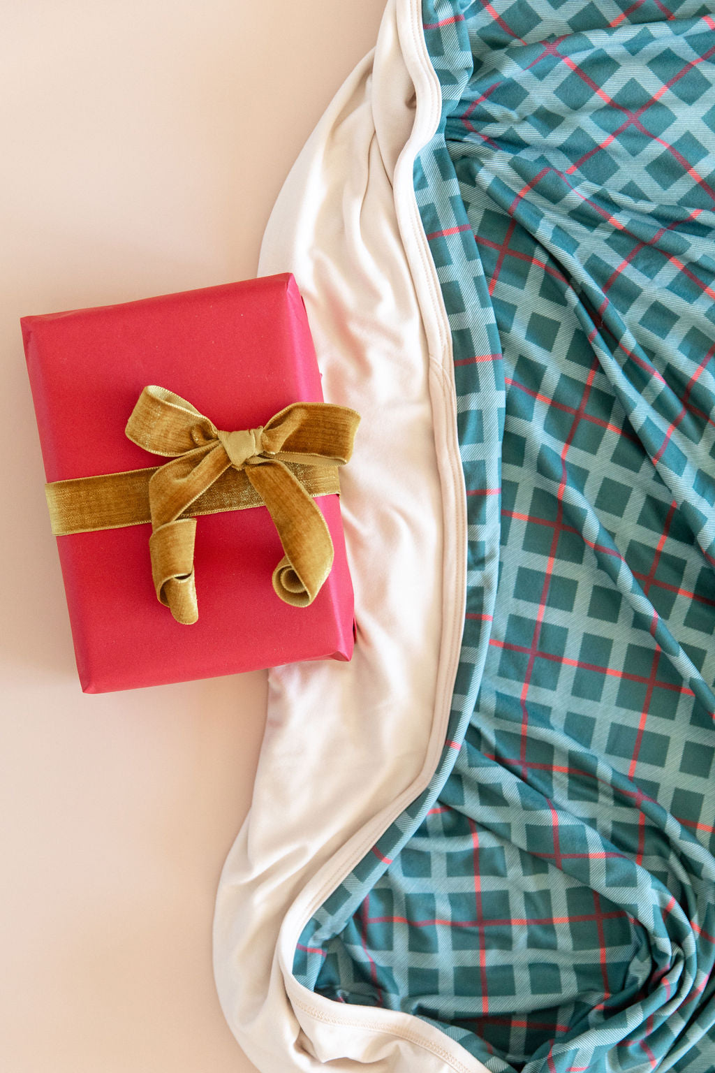 North Pole Green + Red Plaid print blanket with + with a Cream solid reverse.