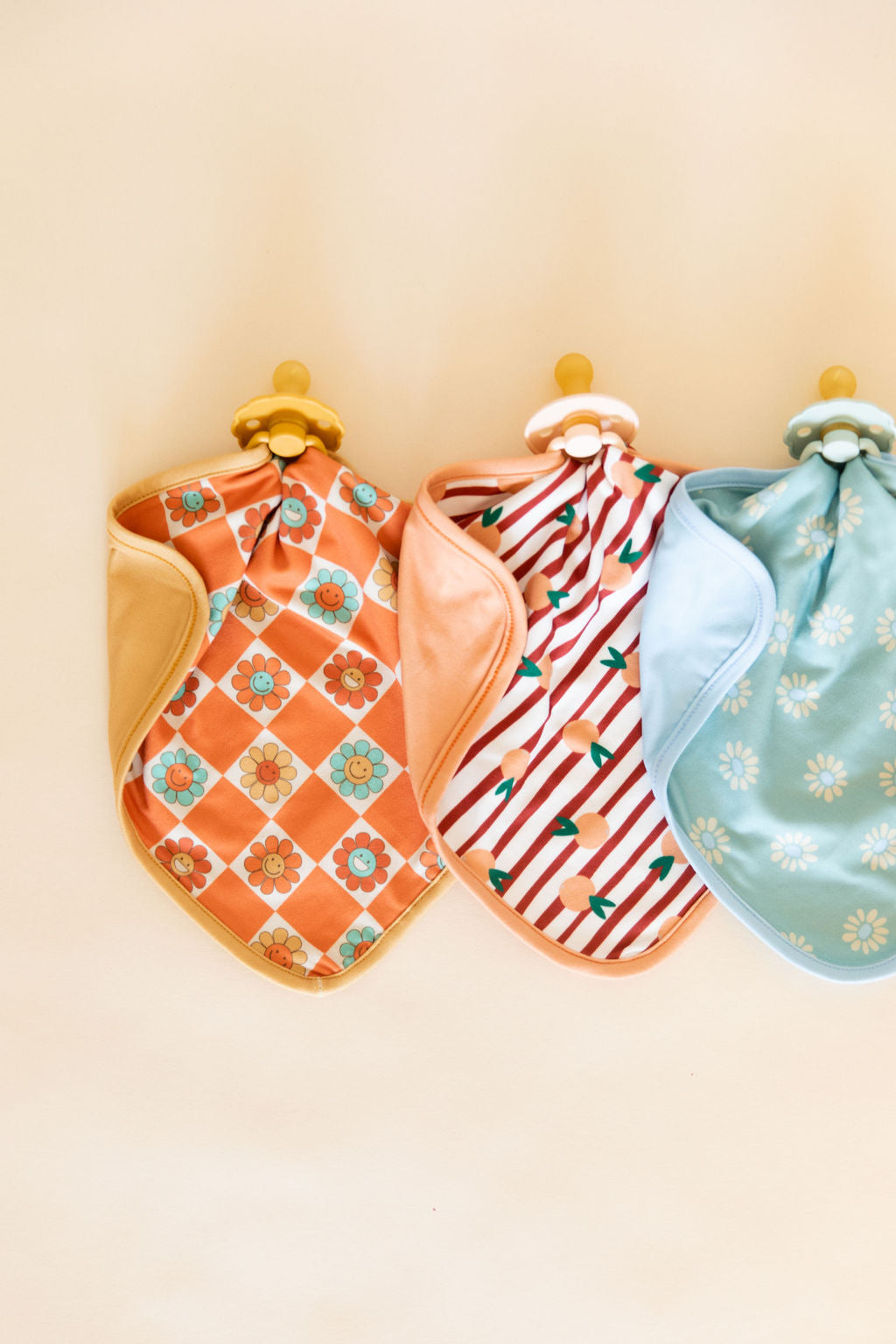 Our Cozys lovies are double sided and can be attached to any pacifier, toy or teether.