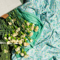 LIGHT BLUE FIELD OF DAISIES PRINT, WITH A GREEN SOLID REVERSE.