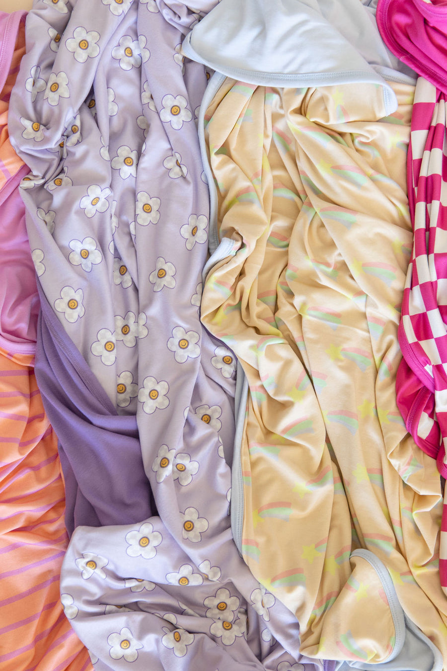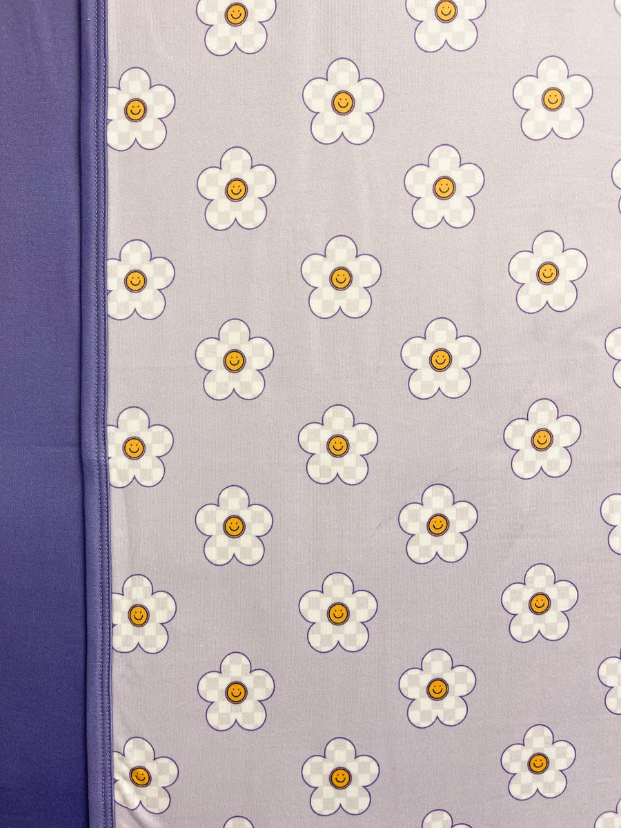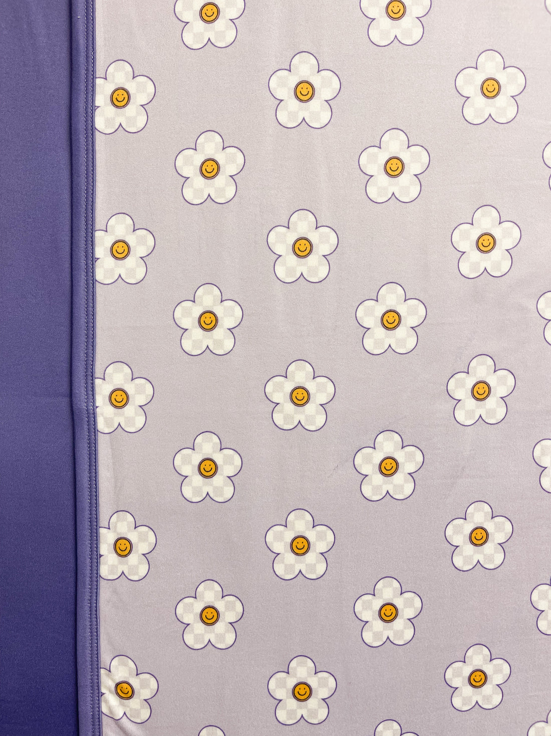 Purple checker daisy with yellow smiley print paired with a darker purple solid reverse.