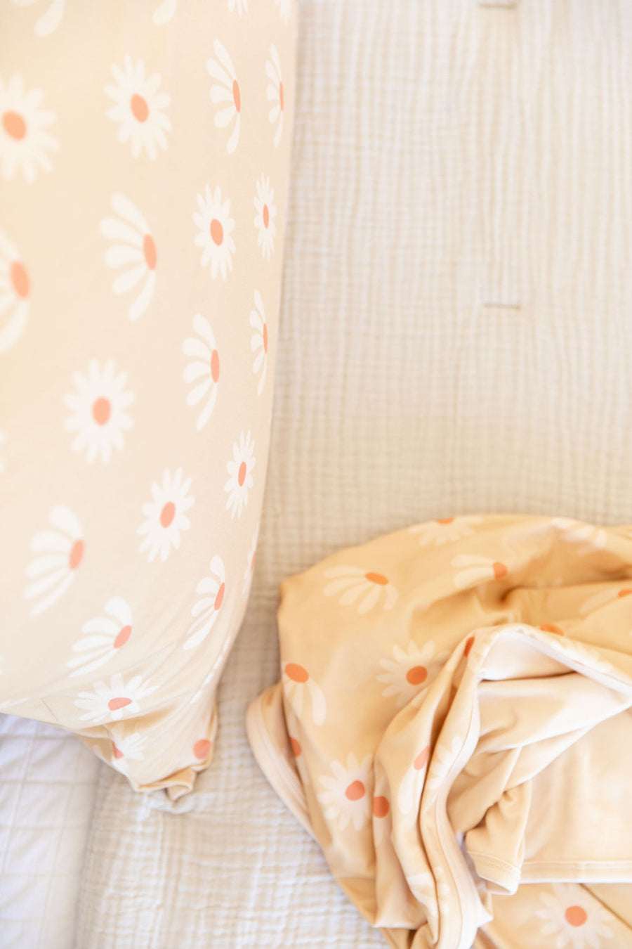 Yellow big daisy print paired with a daffodil yellow solid back.