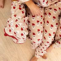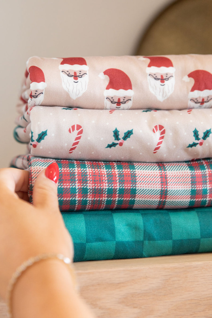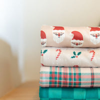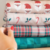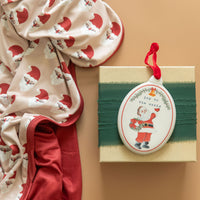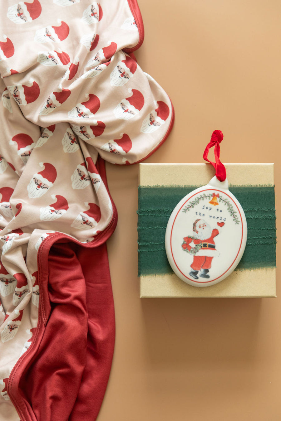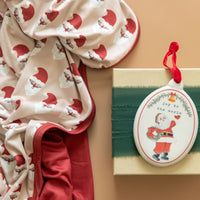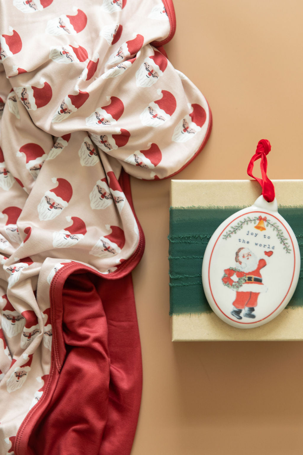 Dark Christmas Red + Light Tan Santas print blanket with a Dark Christmas Red solid reverse.