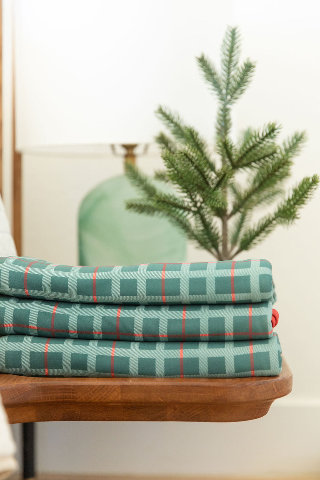 North Pole Green + Red Plaid print blanket with + with a Red solid reverse.