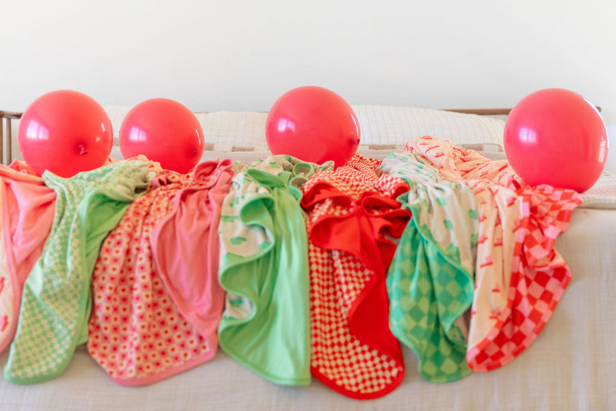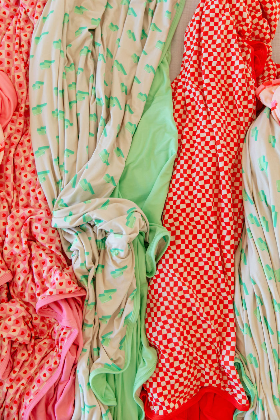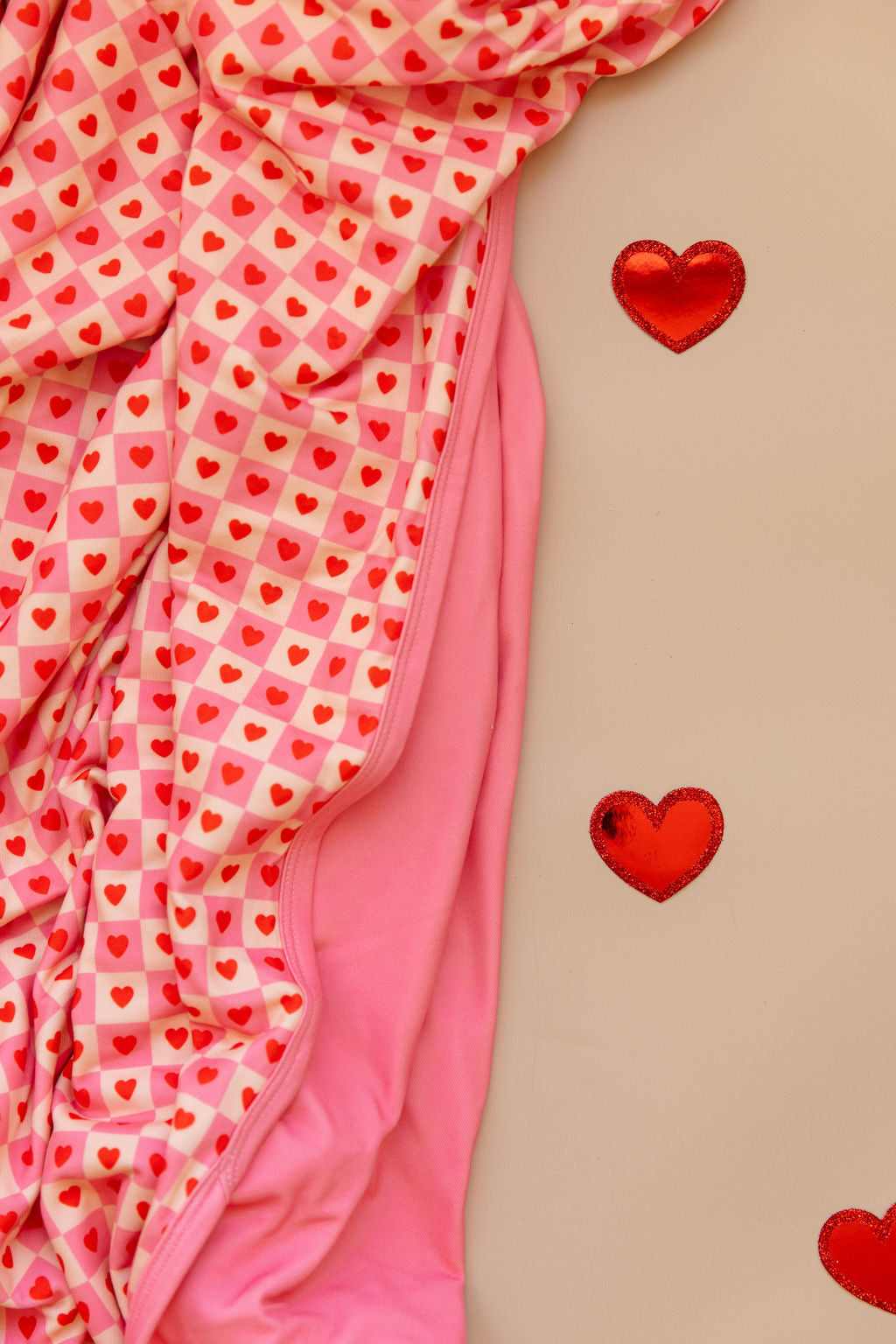 Coral pink, Red, and Bright Peach heart checker print with a Coral Pink solid reverse.
