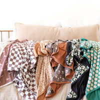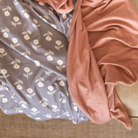 Light Brown, Cream, Rust Floral print blanket + with a Rust solid reverse.