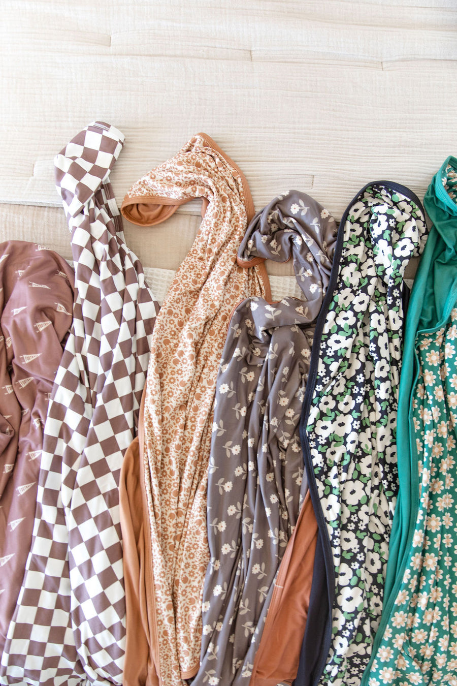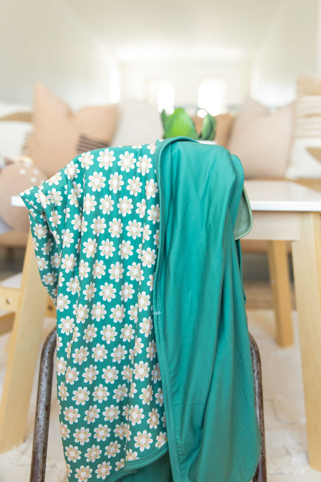 Kelly Green, Off White, Pale Mustard and Blush floral print blanket + with a Kelly Green solid reverse.