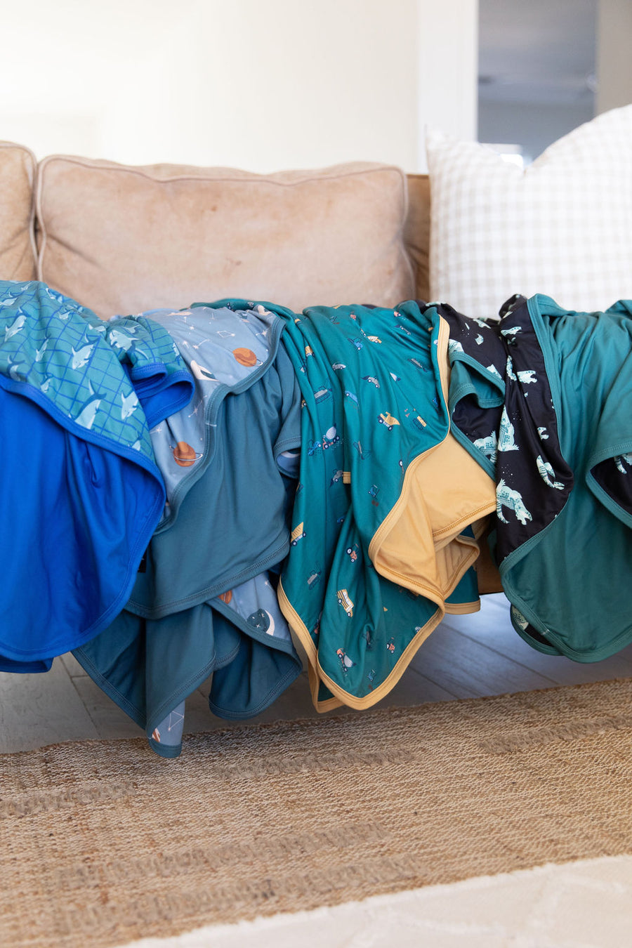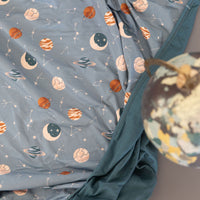 Light Slate Blue background with Rust/Blue/Cream Planets print with a Dark Slate Blue solid reverse.