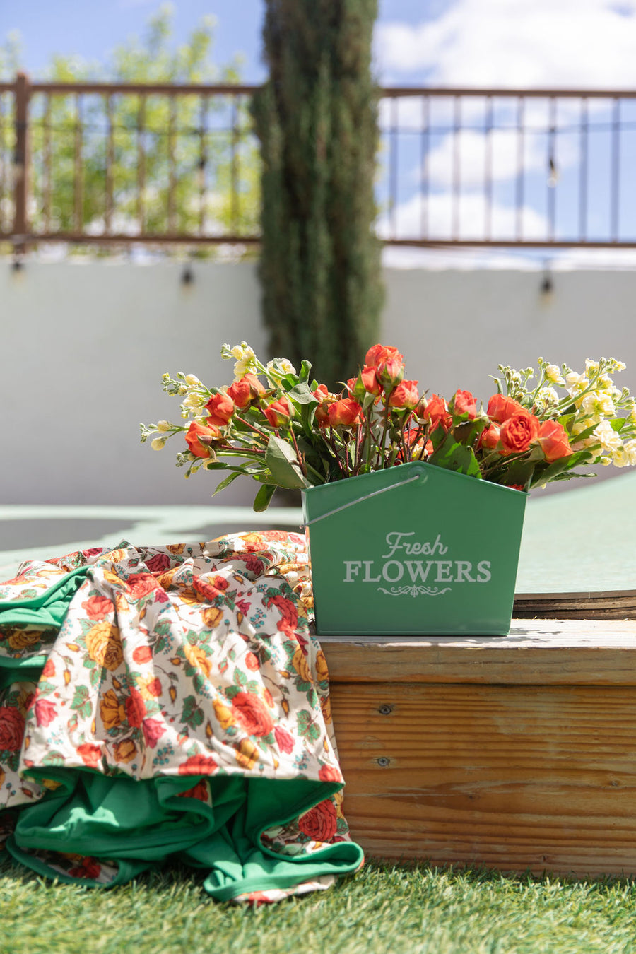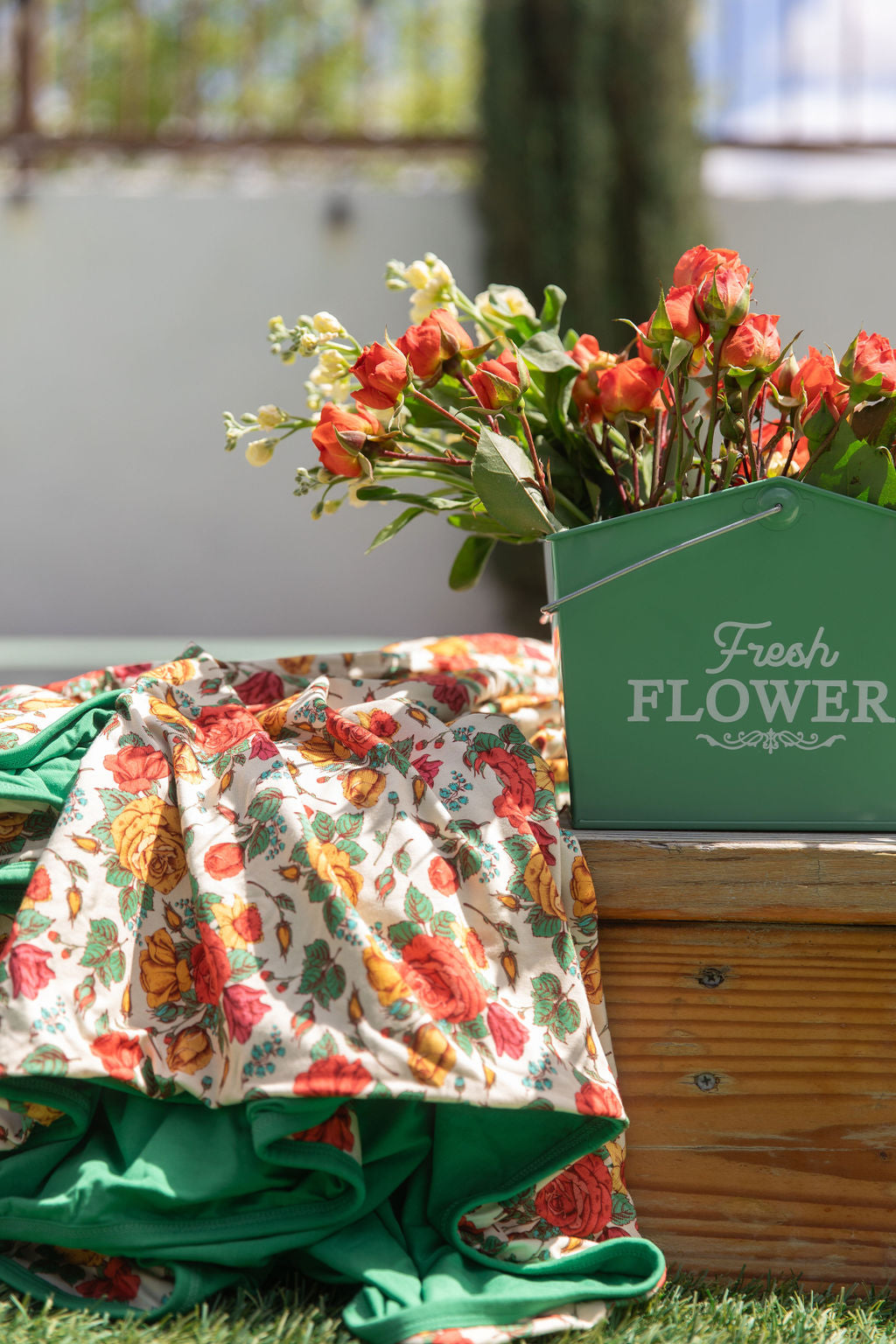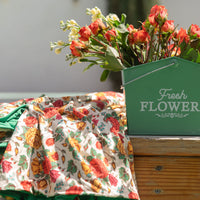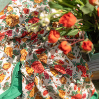 Red, Mustard, and Green vintage roses print with a Green solid reverse.