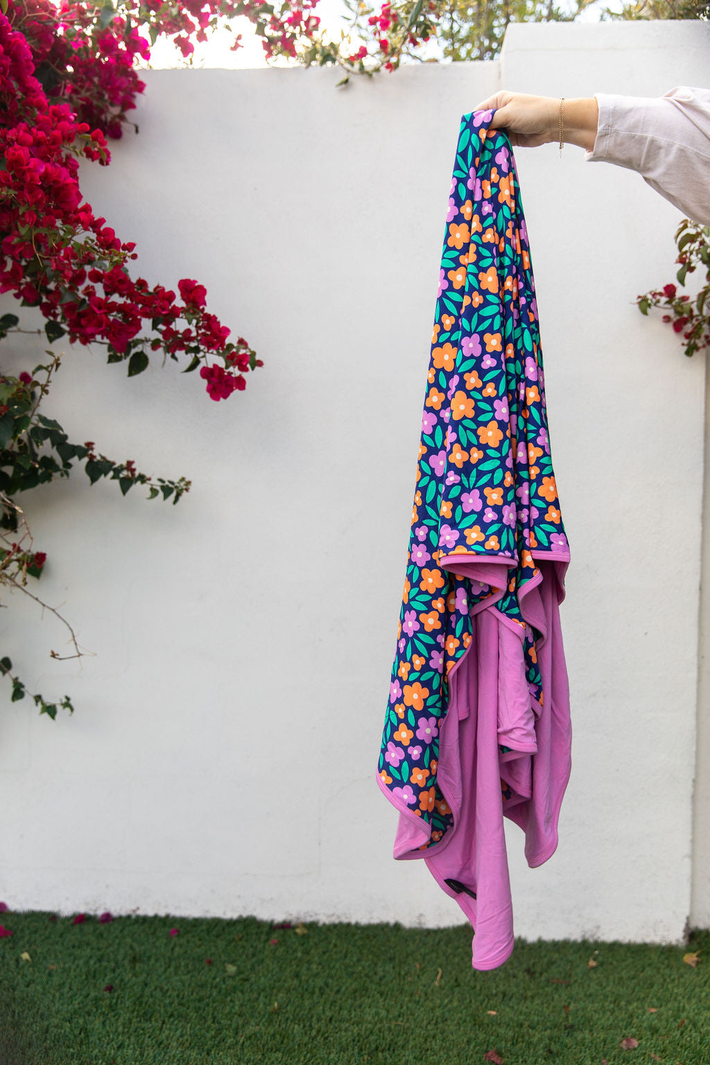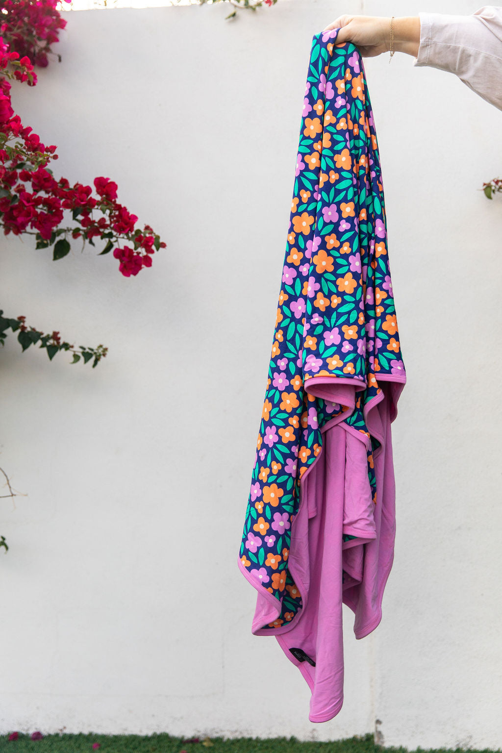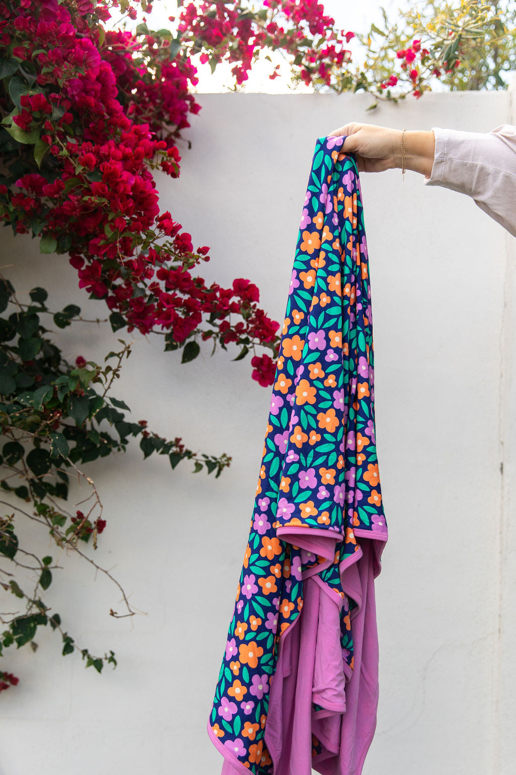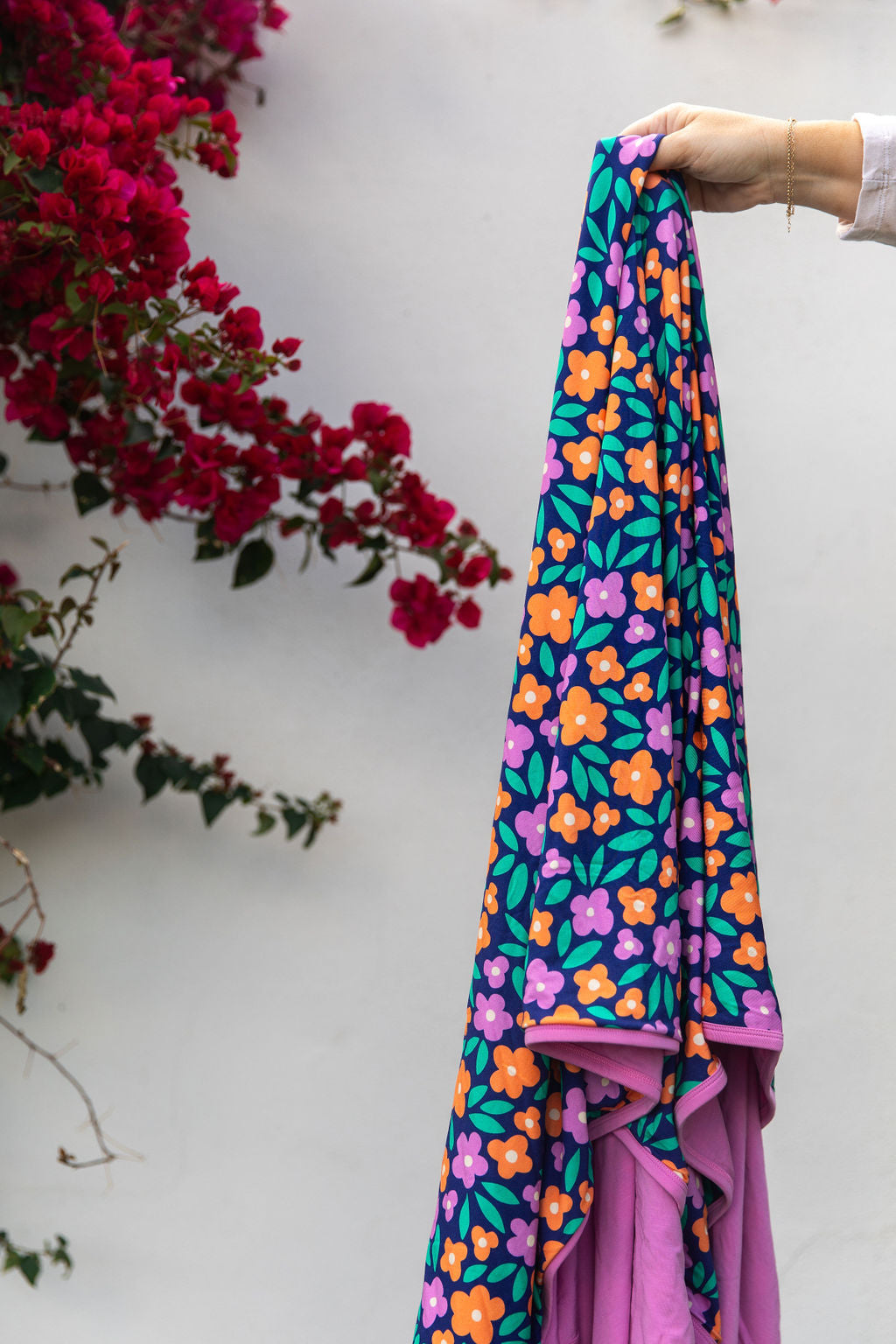 Magenta Purple, Orange + Teal daisy print with a Magenta Purple solid reverse.