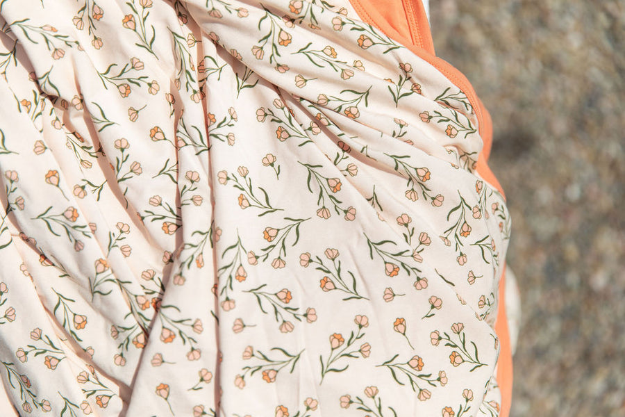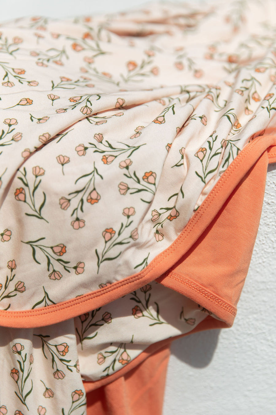 Coral, Light Pink, and Cream daisy print with a Coral solid reverse.