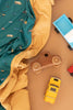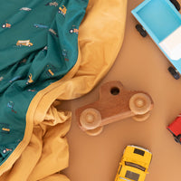 Hunter Green background with Tractors, Cars, and Buses print with a Mustard Gold Yellow solid reverse.