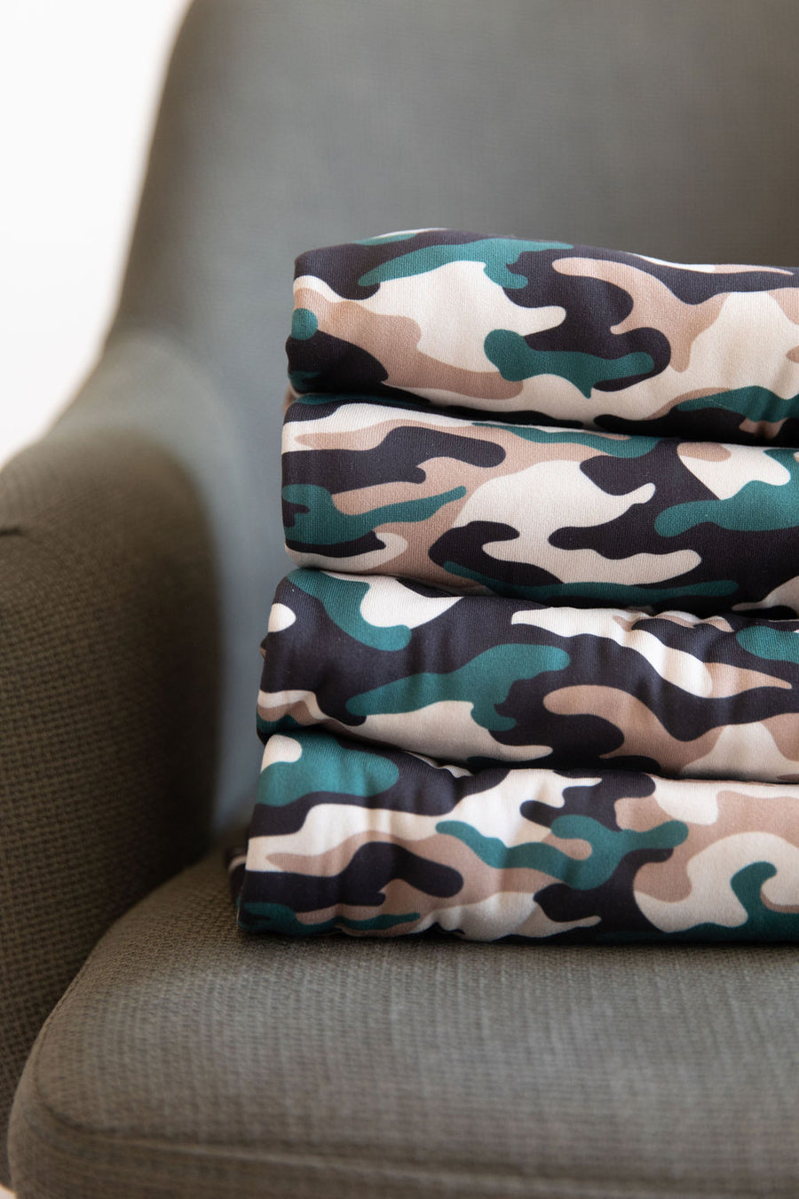 Camouflage print blanket with a black solid reverse.