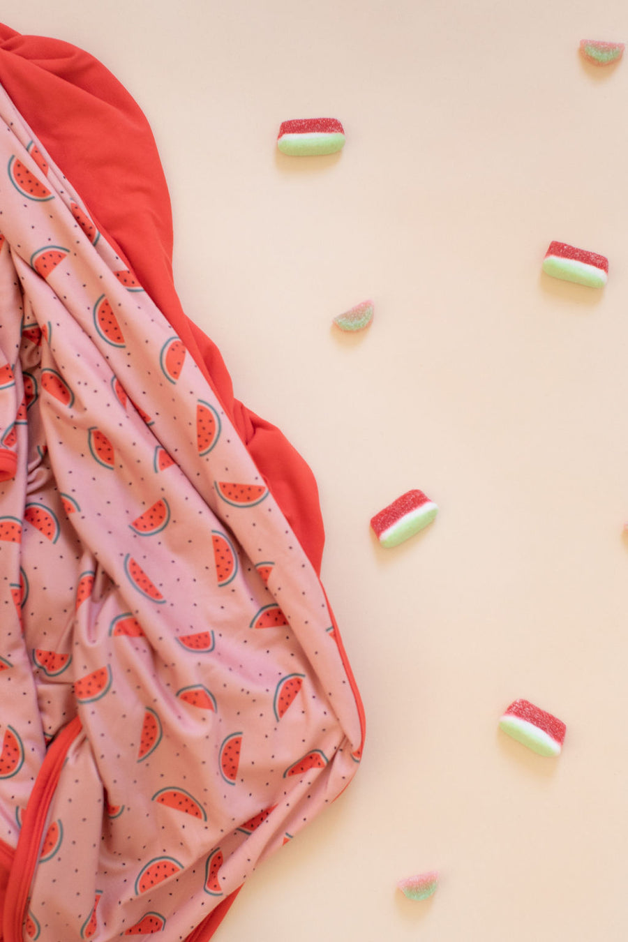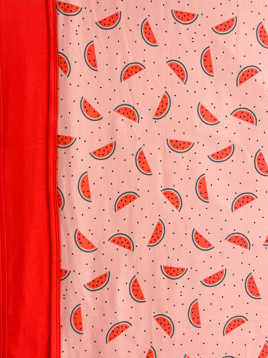 Bright coral red melon print with a soft pink solid background paired with a bright coral red solid reverse.