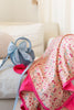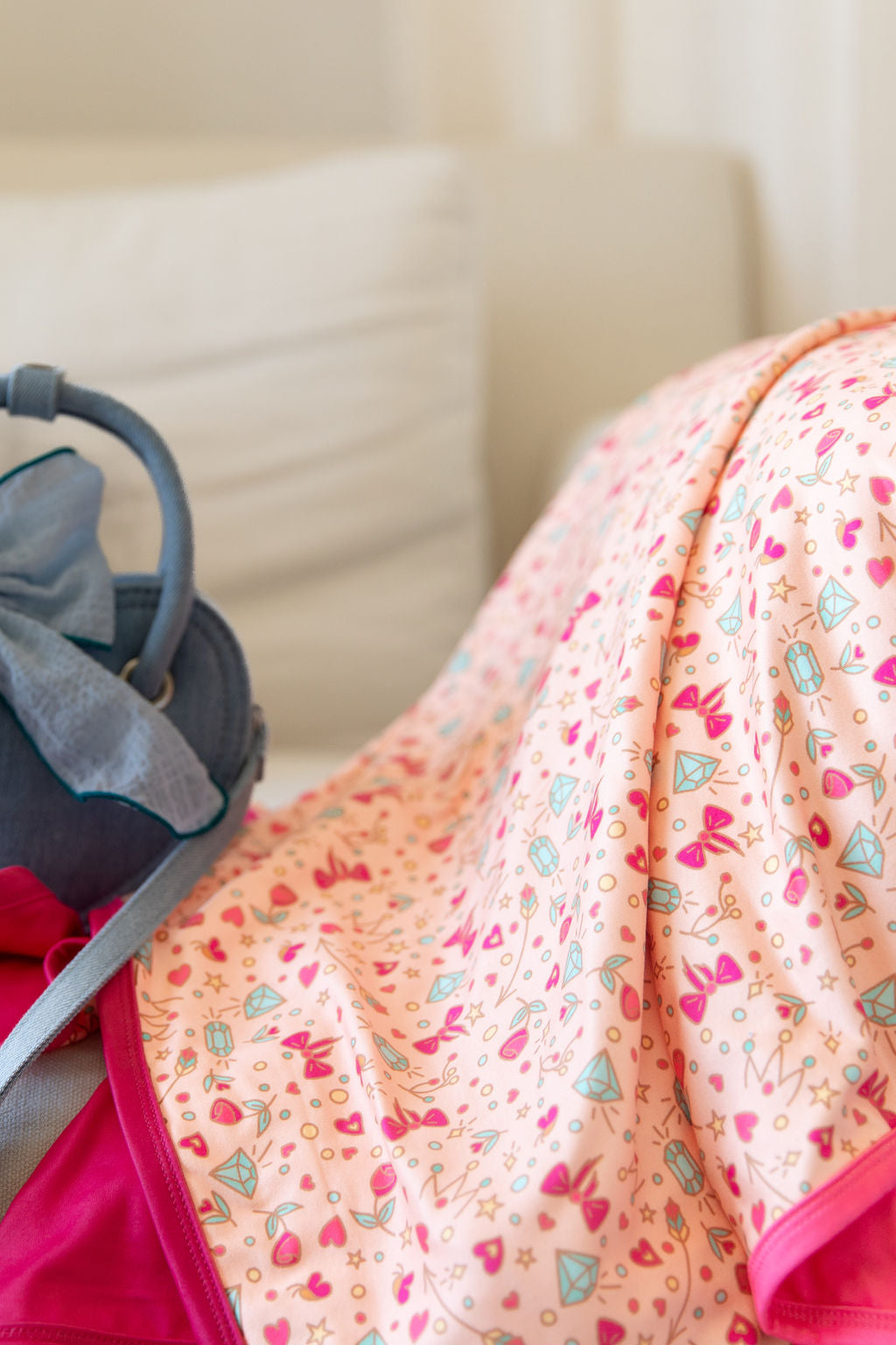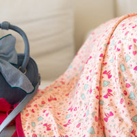 Bright Peach 'Frills' girly print blanket with a Bright Pink solid reverse.