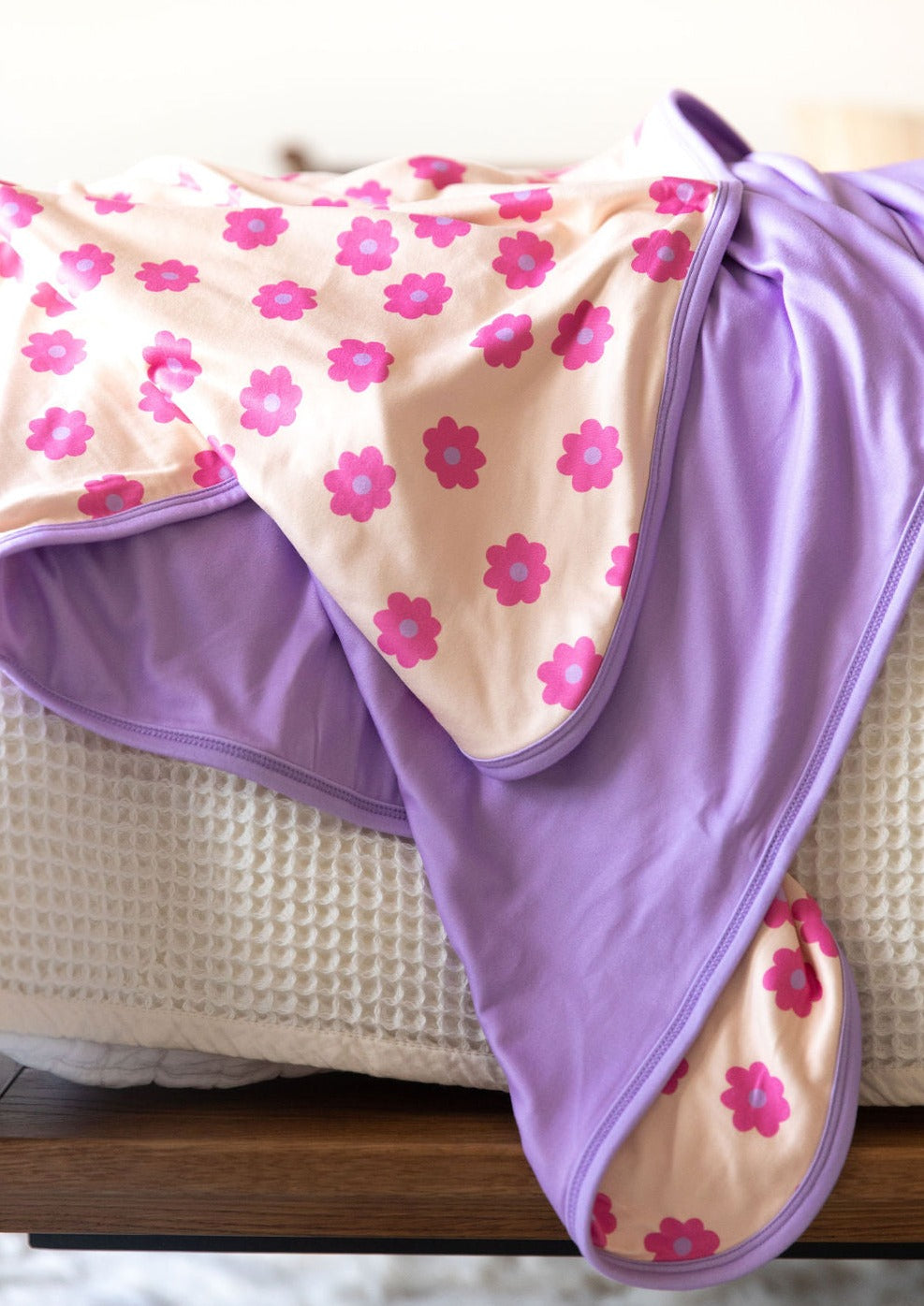 Bright pink + purple daisy print with a light peach background, paired with a bright purple solid back.